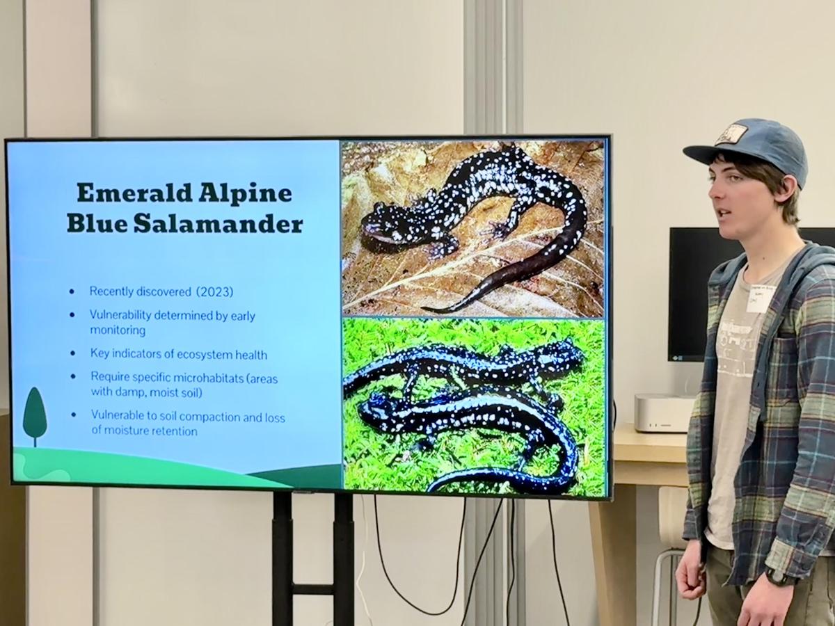 At one table, student biologists impressively fielded questions about soil compaction, habitat elevation and breeding cycles. They explained how deer hunting can prevent overbrowsing and benefit salamander habitat; while on the flip side noting that hunters and hikers can trample leaf litter and damage sensitive stream habitats.