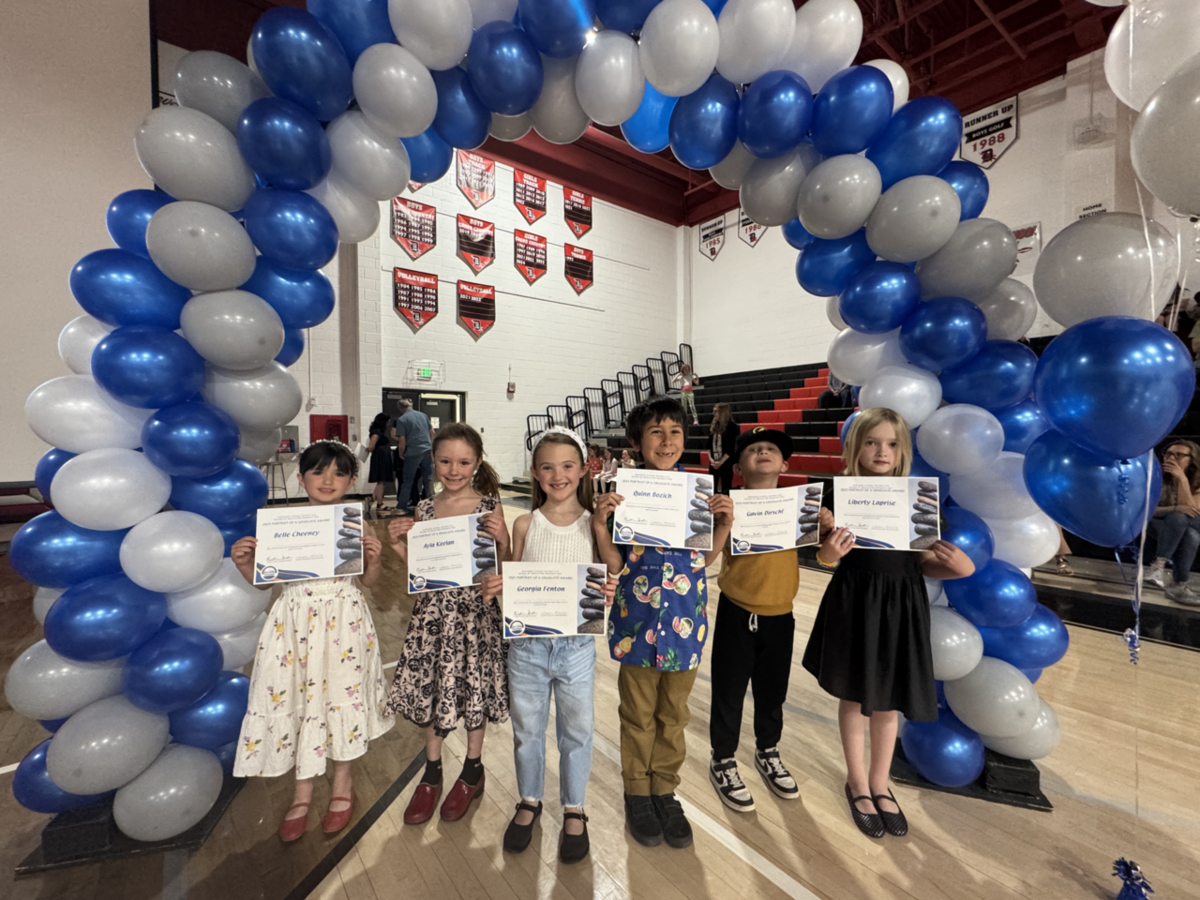 Smiling elementary students hold awards certificates under a balloon arch